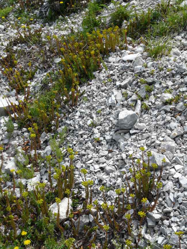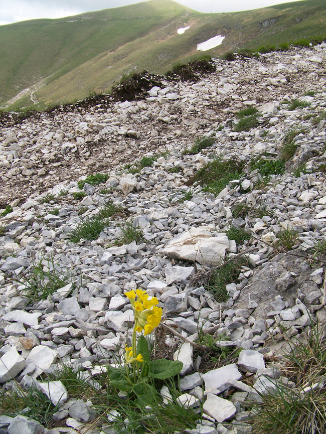 Pendice detritica nella zona sommitale del M. Catria con Primula veris suaveolens, maggio 2010