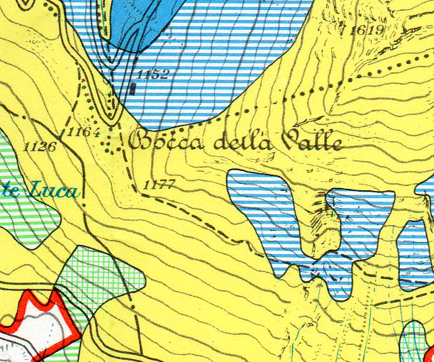 Pendici di Sud-Ovest del M. Acuto presso Bocca della Valle. In giallo pascoli; in blu formazioni con prevalenza di Faggio, cedui. Carta forestale 1:25.000 Az. Spec. Consorz. Catria, Ed. S.E.C.L.A., 1987