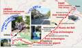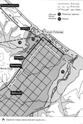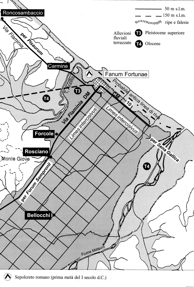 Percorso stradale da Fanum Fortunae a Sena Gallica, corrispondente all'attuale via del Fiume. Carta della viabilità nella bassa valle del Metauro e centuriazione del territorio di Fano in età augustea (da: DE SANCTIS, 2004)
