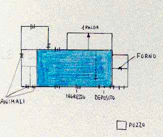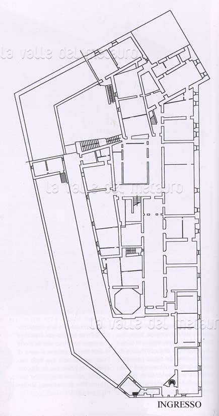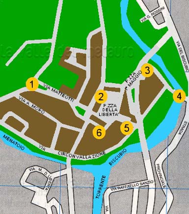 Pianta del centro storico di Piobbico. Legenda: 1 - Oratorio di S. Carlo; 2 - S. Pietro; 3 - S. Antonio; 4 - S. Stefano; 5 - Santuario di S. Maria in Val d'Abisso; 6 - Palazzo Brancaleoni