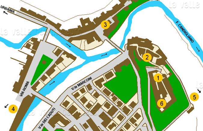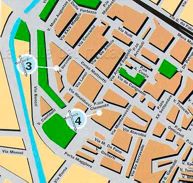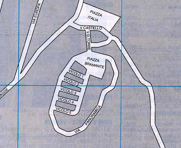 Legenda: (1) Ponte; (2) Torre; (3) Fontana "il Mascherone"; (4) Chiesa di S. Veneranda; (5) Chiesa di S. Maria Maddalena; (6) Palazzo Bramante