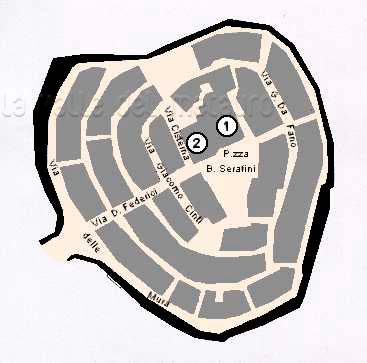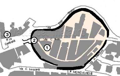 Pianta del centro storico di Orciano di Pesaro. Legenda: (1) Chiesa S. Maria Novella e Torre Malatestiana; (2) Ex Palazzo Ducale ed ex Monastero Benedettino; (3) Ex Chiesa di S. Caterina ed ex Monastero Agostiniano