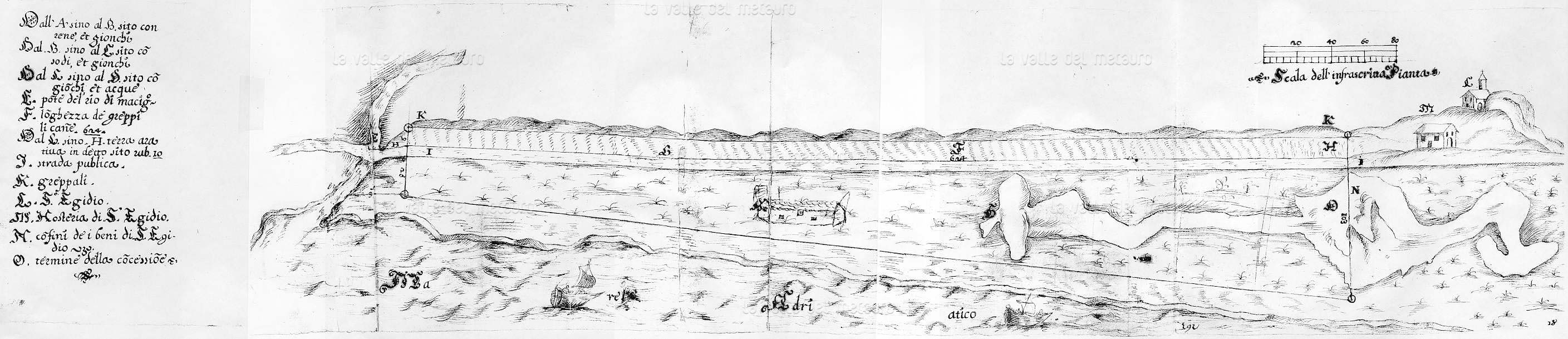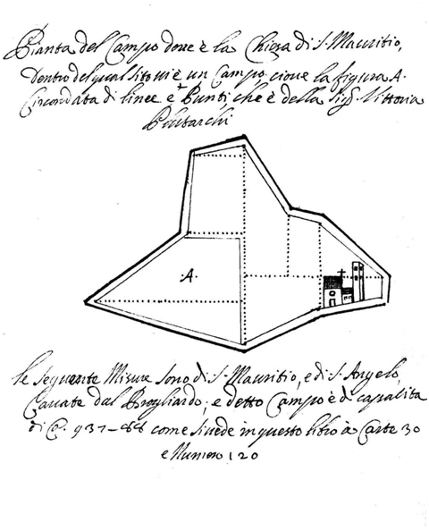 Pianta del Campo dove è la Chiesa di S. Maurizio… Archivio di Stato di Fano, Libro Brogliardo delle Misure fatte per l’Appasso Generale dell’Ill.ma Città di Fano per il territorio di Sorbolongo, 1625