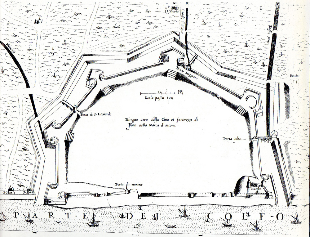 Pianta schematica di Fano del 1569, di Giulio Ballino (da PANICALI E BATTISTELLI 1977). Un fiumiselo giunge alle mura presso Porta S. Leonardo, un canale d'acqua ad un mulino a Porta Maggiore, il taglio novo lambisce le mura romane della Mandria sino alla Rocca Malatestiana
