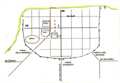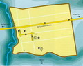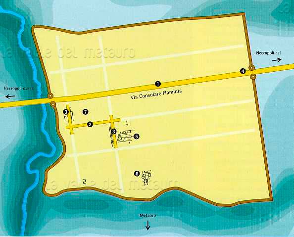 Pianta di Forum Sempronii a San Martino del Piano (Fossombrone) (disegno G. Gori). Nella pianta, che riproduce l'impianto della cittŕ, sono indicati i principali resti riportati alla luce dallo scavo archeologico: 1) Decumanus maximus, 2) Decumanus minor, 3) Cardo, 4) Porta Gallica, 5) Domus, 6) Edificio termale, 7) Insula