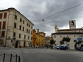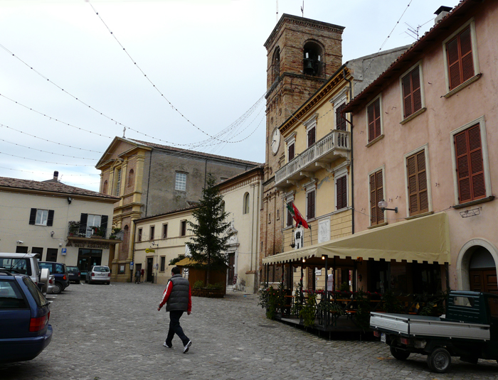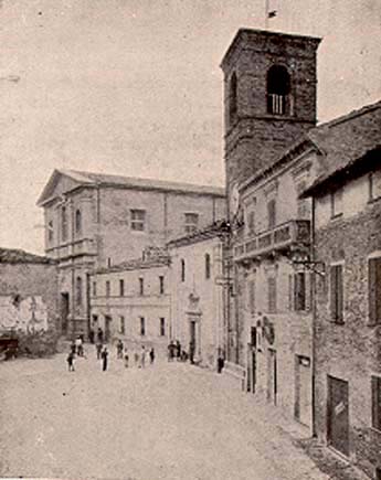 Piazza Barocci a Mombaroccio (da LOCCHI 1934). Sono visibili la Torre civica, la Chiesa di San Marco e la Chiesa di S. Vito e Modesto
