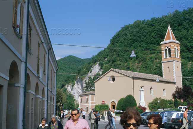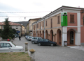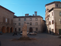 Piazza Mazzini (di fronte alla Cattedrale) a Fossombrone, con fontana settecentesca e Palazzo del Magistrato dotato di portici. In primo piano un frammento di epigrafe dedicatoria all'imperatore Claudio (foto S.E.F.)