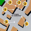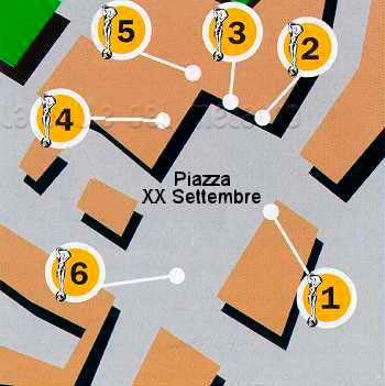 Piazza XX Settembre a Fano. Legenda: 1 - resti di edificio romano; 2 - resti di edificio romano; 3 - Pavimenti a mosaico; 4 - Palazzo del Podestà e Teatro della Fortuna; 5 - Palazzo Malatestiano; 6 - Fontana della Fortuna