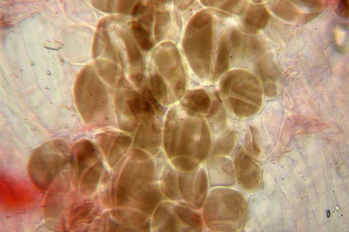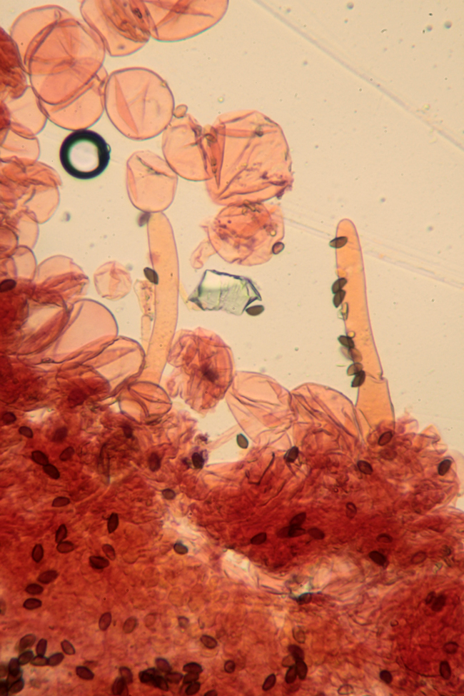 Pileipellis di Pluteus romellii, Rio Secco presso Cartoceto, aprile 2014. Cellule sferiche pigmentate di bruno