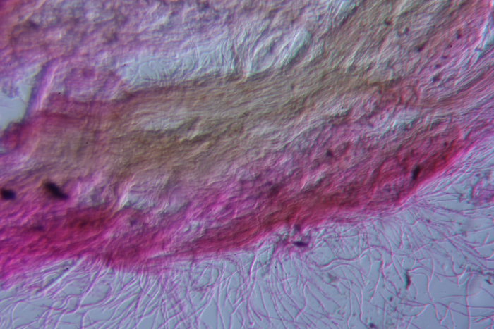 Pileipellis di Tricholoma aurantium, M. Catria, ottobre 2013. La cuticola del fungo è vischiosa e gelatinosa; al microscopio appare immersa in una gelatina giallastra