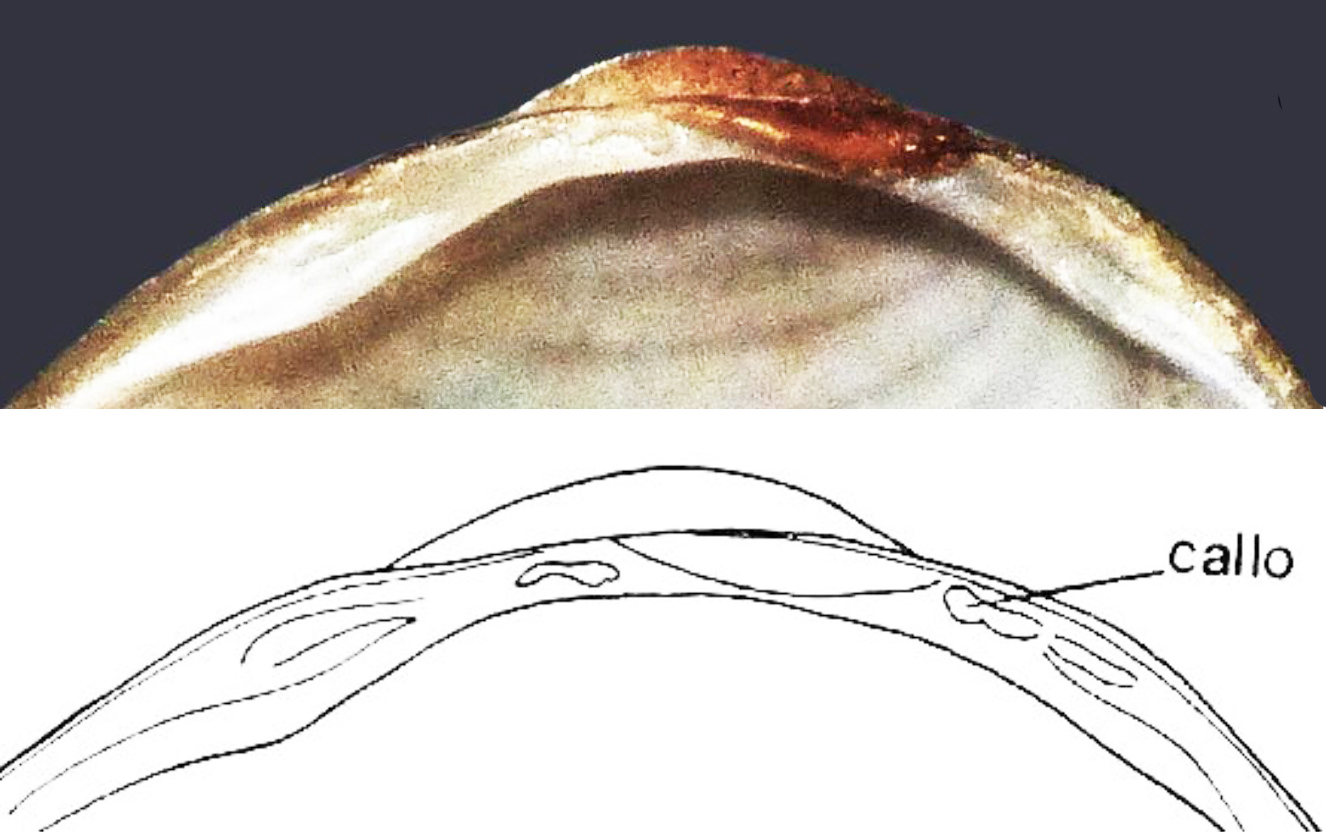 Pisa nodipes maschio di 36x20 mm (esempl. conservato), Adriatico al largo della Provincia di Pesaro e Urbino, 1970 circa, con indicato in rosso il tubercolo nella regione epatica
