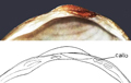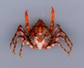 Pisidia longimana, chelipede con indicate in rosso la spina nel mero e le due spine nel carpo; a dx per confronto: Pisidia longicornis, chelipede con indicato in rosso il mero.
