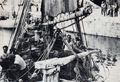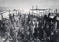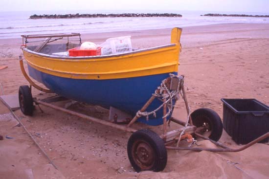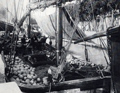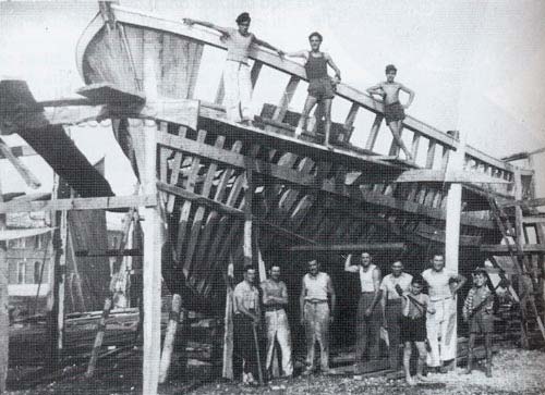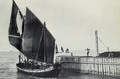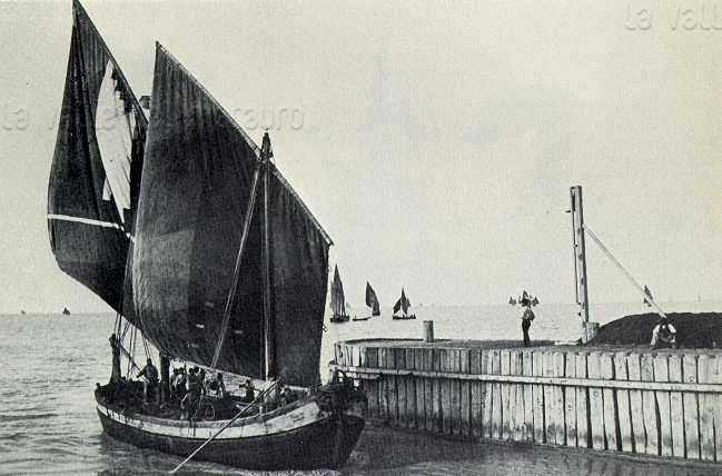 Barchetto all'imboccatura del porto di Fano. E' visibile il molo su palafitte in legno (''palate''), primi del 1900 (da AMADUZZI, 1987)