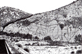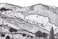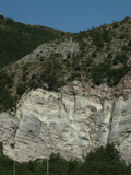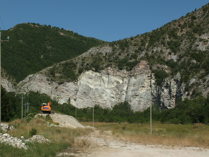 Poggio della Rava nella Gola del Biscubio all'altezza della confluenza del Rio Vitoschio (dallo stesso punto di osservazione del disegno a lato), giugno 2012. Nelle pendici affacciate sul torrente, dall’alto verso il basso affiorano la Scaglia Variegata (poco riconoscibile nell’immagine), la Scaglia Rossa, la Scaglia Bianca e le Marne a Fucoidi