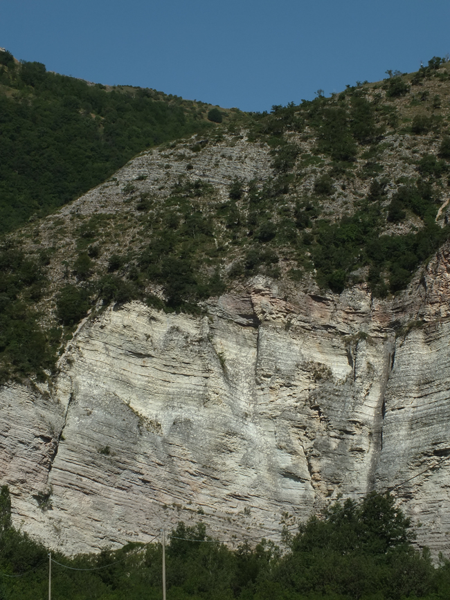 Poggio della Rava, Gola del Biscubio all'altezza della confluenza del Rio Vitoschio, giugno 2012. Particolare della parete rocciosa controllata dall’erosione fluviale sulla quale affiorano le Marne a Fucoidi (verso il basso) la Scaglia Bianca con il Livello Bonarelli (sottile, di colore bruno, in evidenza alla sommità della formazione), la Scaglia Rossa (alla sommità della parete rocciosa)