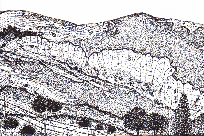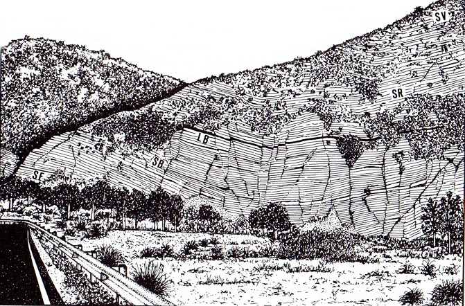 Poggio della Rava nella Gola del Biscubio all'altezza della confluenza del Rio Vitoschio (da: PASSERI 1994). SF = Marne a Fucoidi; SB = Scaglia Bianca; LB = Livello Bonarelli; SR = Scaglia Rossa; SV = Scaglia Variegata