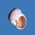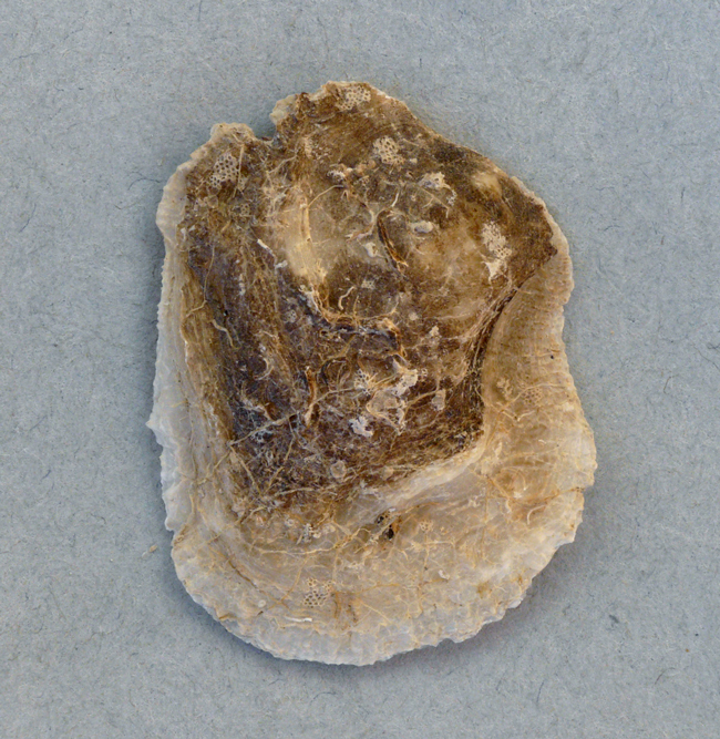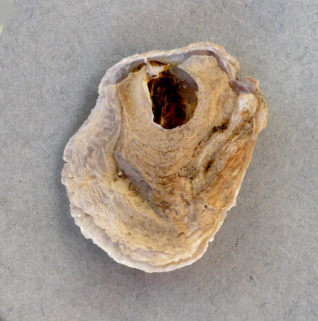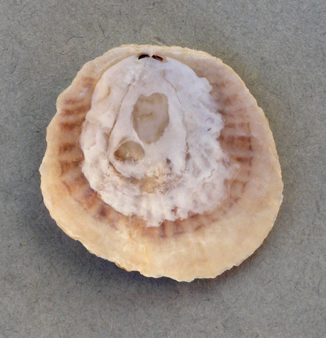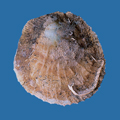 Pododesmus patelliformis di 40 mm (valva sinistra, la superiore), al largo di Chioggia (VE), su Atrina fragilis