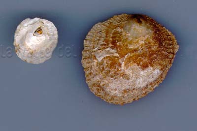 Pododesmus patelliformis di 40 mm (valva destra, l'inferiore), al largo di Chioggia (VE), su Atrina fragilis