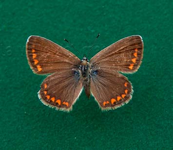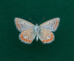 Polyommatus thersites maschio, M. Pietralata (Monti del Furlo), agosto 1993. Parte inferiore delle ali posteriori con prima lunula submarginale che presenta il colore arancio come le altre
