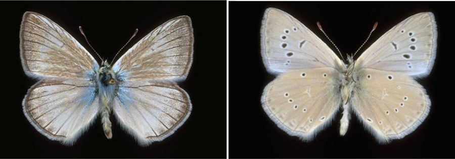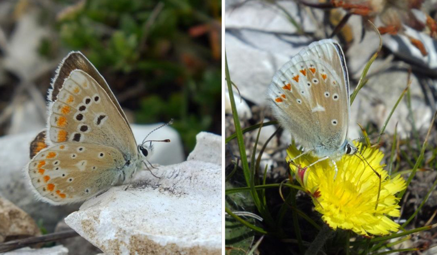 Polyommatus dorylas femmina, M. Acuto (Gruppo del M. Catria), luglio 2015; a destra: maschio, M. Catria, luglio 2015