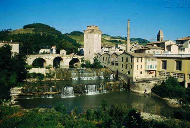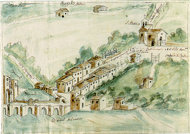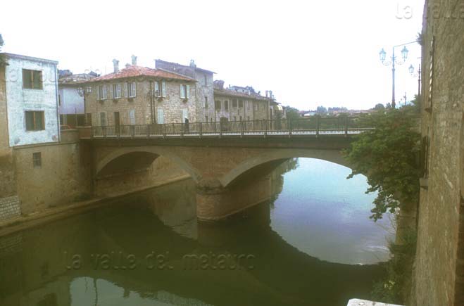 Ponte di Fossombrone, disegno del 1734. Il ponte è quello a cinque archi, distrutto da una piena nel 1765. Arch. Storico Pesaro, Legazione apostolica, Risposte a circolari, b.5, 1732 (da BERRETTA, 1999)