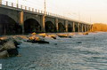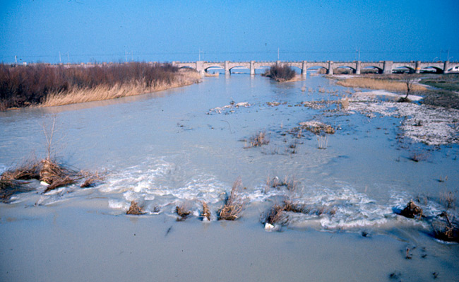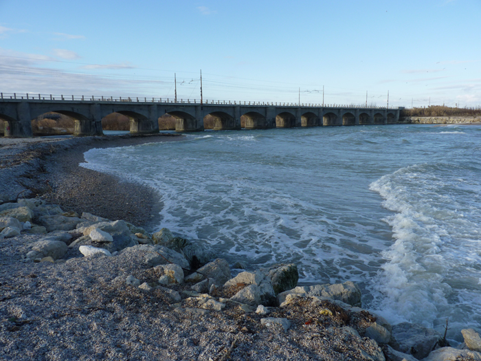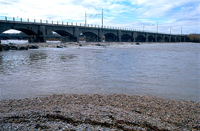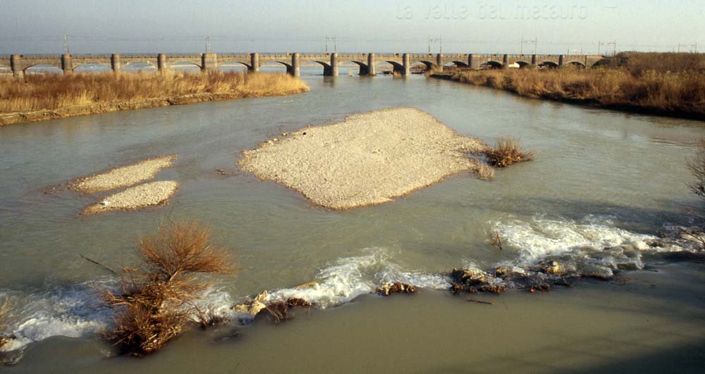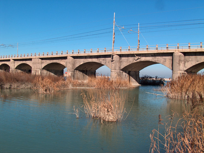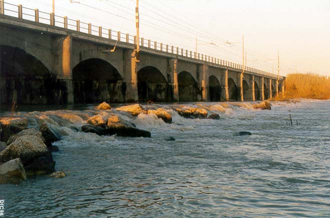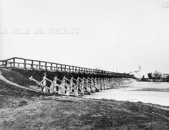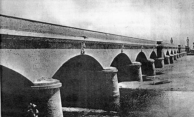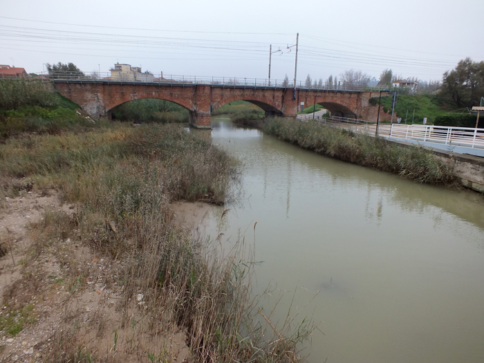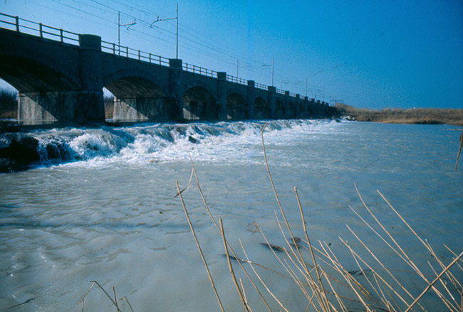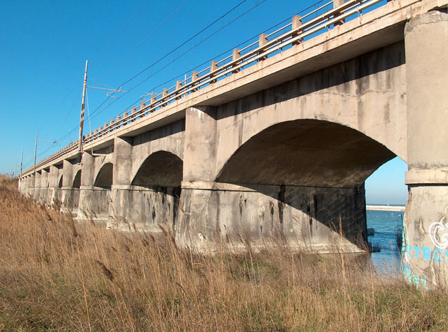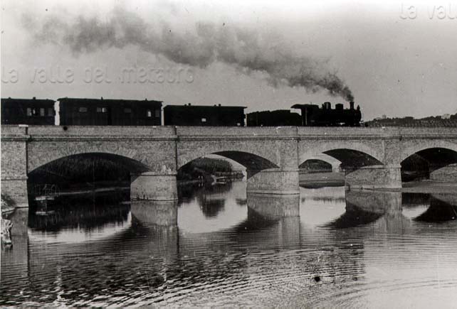 Ponte ferroviario presso la foce del T. Arzilla ai primi del 1900 (foto d'epoca). Il ponte era a cinque archi