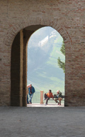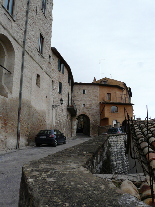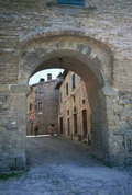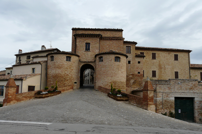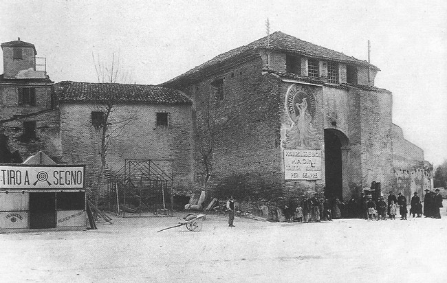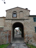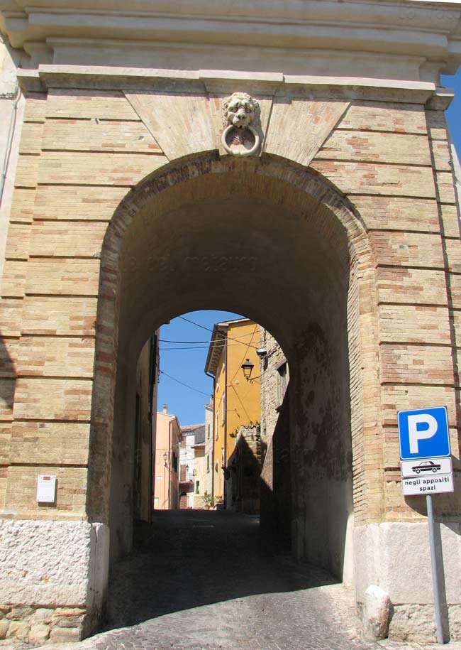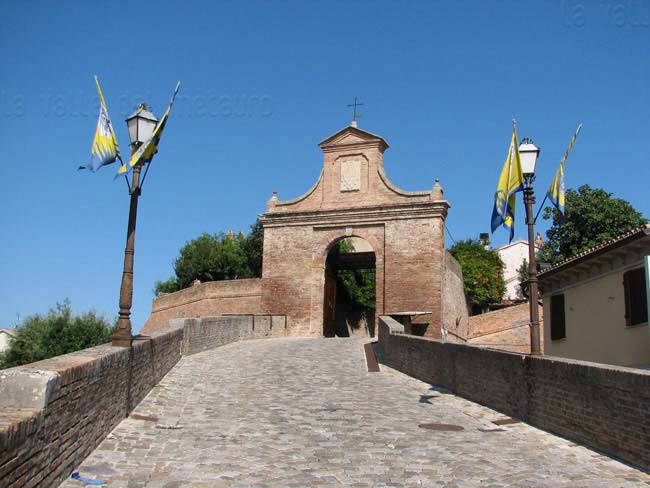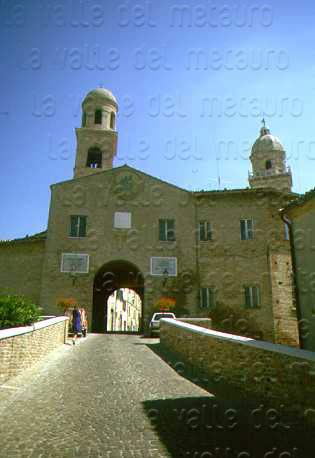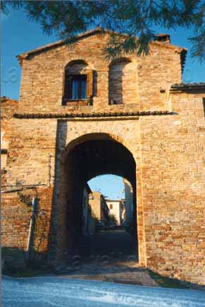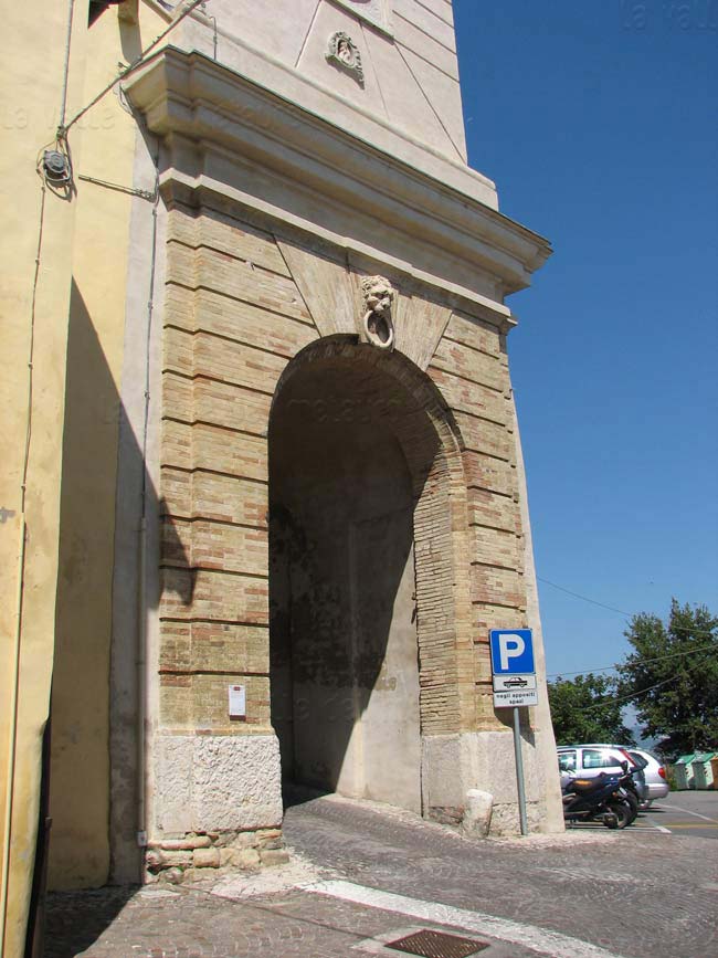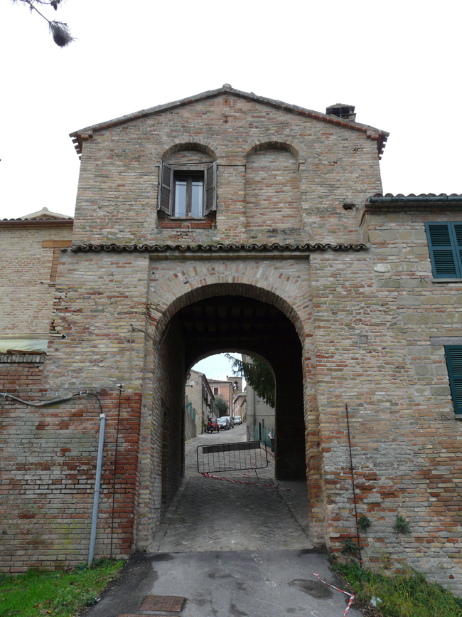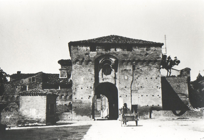 Porta Maggiore di Fano prima del 1928, quando venne aperto un varco nelle mura difensive alla sua sinistra e demolito il Mulino omonimo (foto d'epoca). E' ancora presente il primo piano della Porta