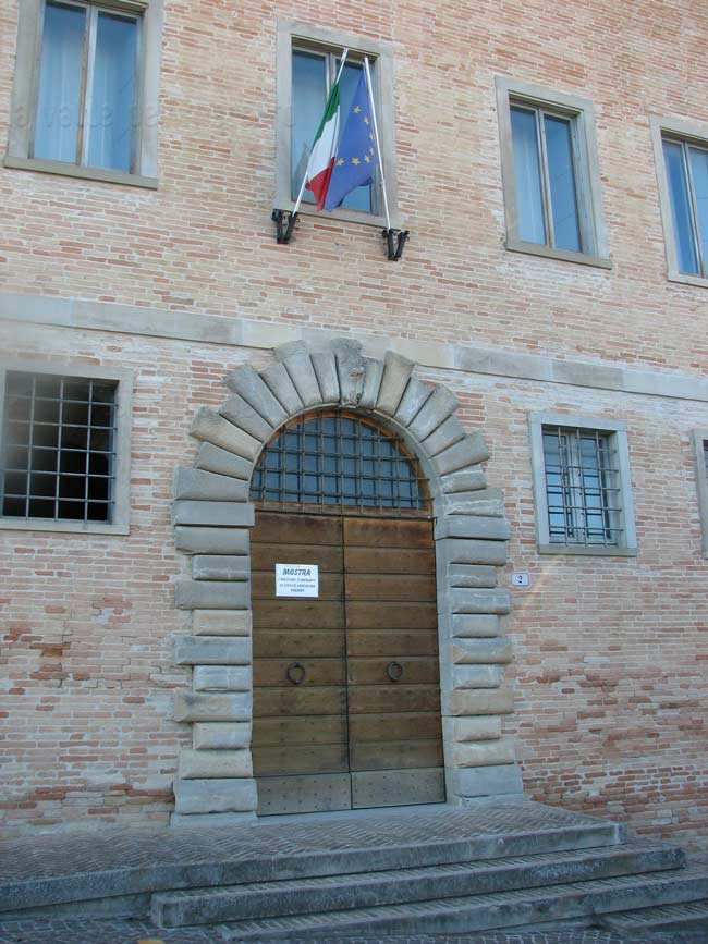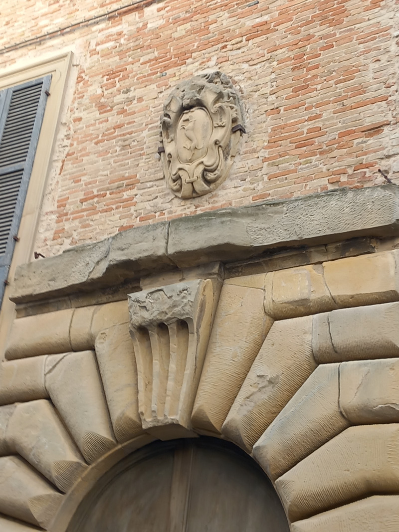 Portale del Palazzo Castracane sulla via omonima, aprile 2025. Il portale è sovrastato dallo stemma della famiglia con il caratteristico cane rampante