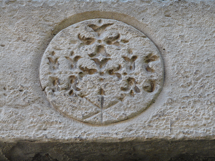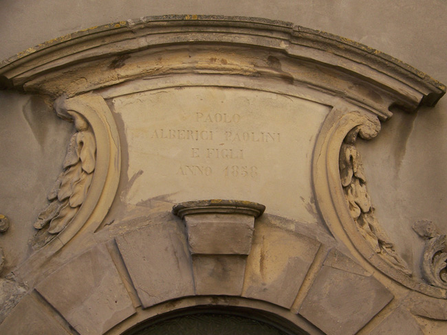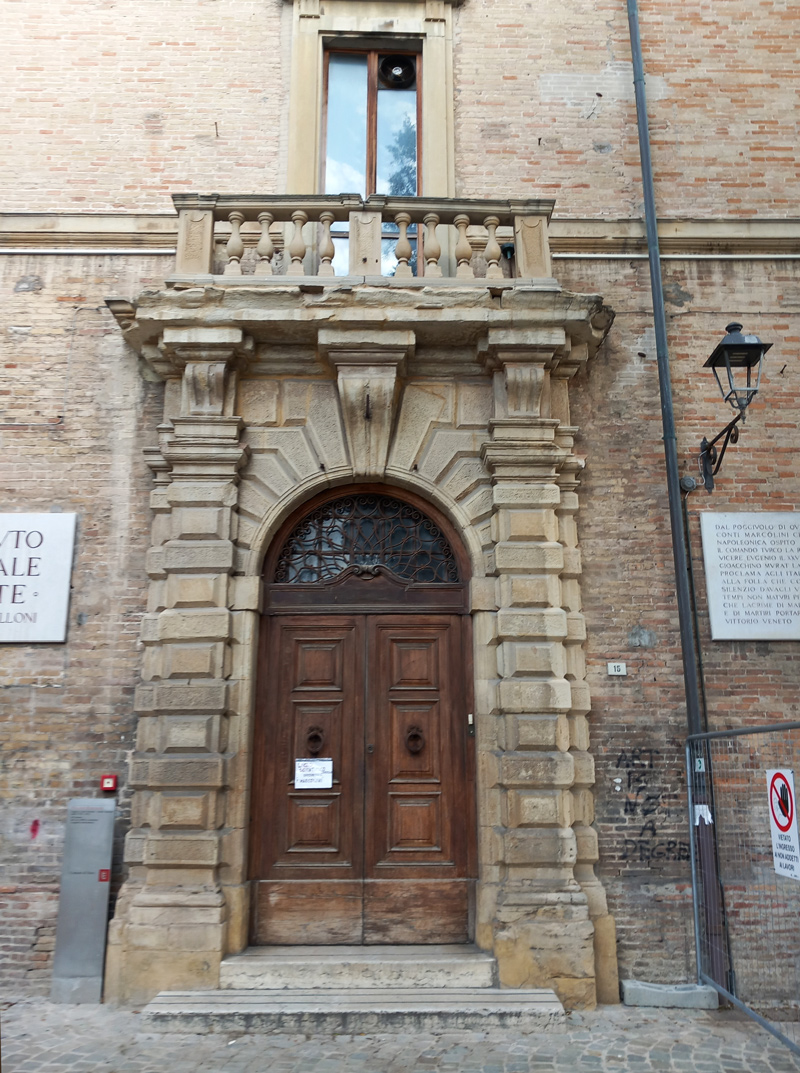 Portale del Palazzo Galantara, poi Baccarini, lungo il Borgo Cavour a Fano, marzo 2025. Sopra il portale lo stemma della Famiglia Baccarini De Grandis