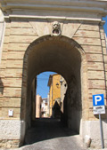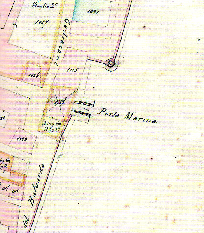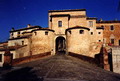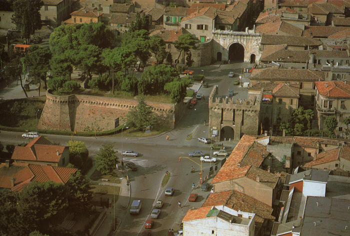 Porta Maggiore e, alla sua sinistra, il Bastione del Nuti; più indietro l'Arco d'Augusto (da: BATTISTELLI e DELI 1983). Porta Maggiore è all'incrocio tra Via Roma, che prosegue verso il centro di Fano con Via Arco d'Augusto, e Viale Buozzi (verso sinistra)-Viale Gramsci (verso destra)