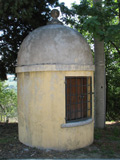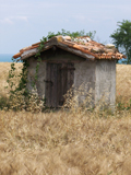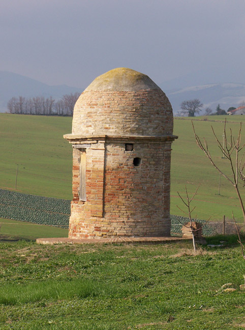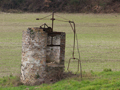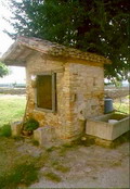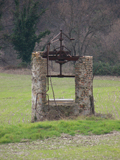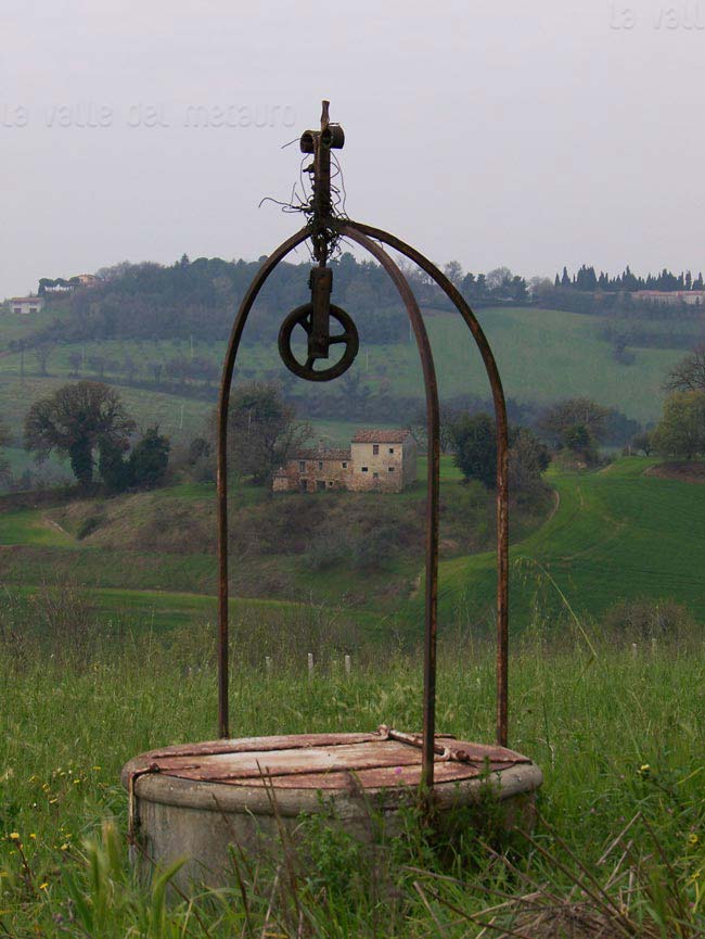 Pozzo in località C.se Galari (M. Giove a Fano), aprile 2007. La sua tipologia è diversa da quella dei pozzi della nostra zona: di cemento e con forma circolare, è chiuso da uno sportello di lamiera; tre sbarre di ferro sorreggono una carrucola