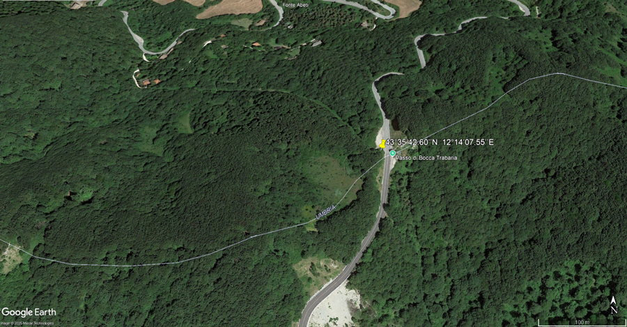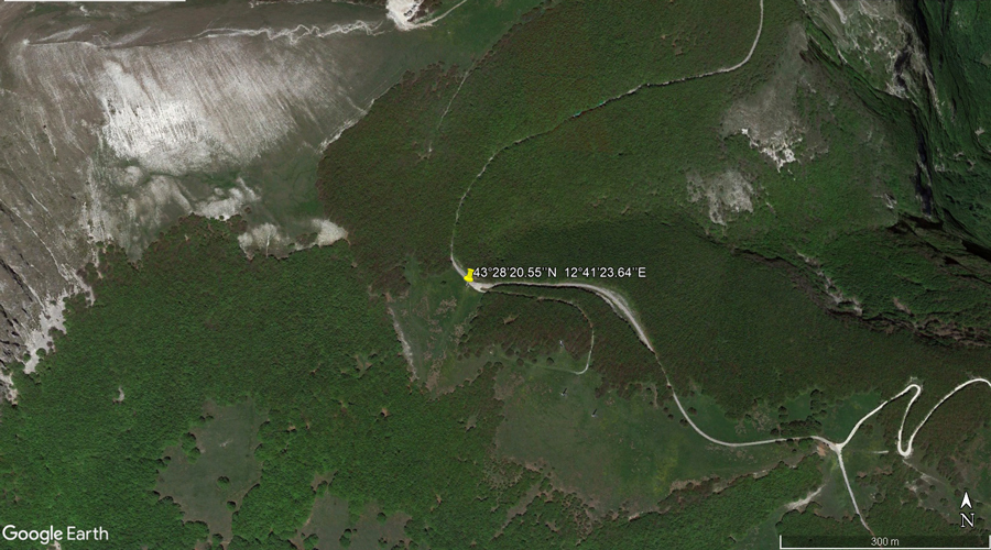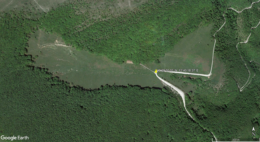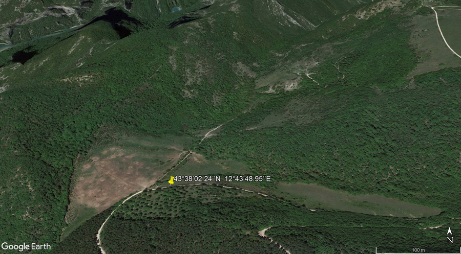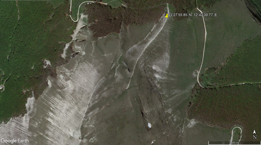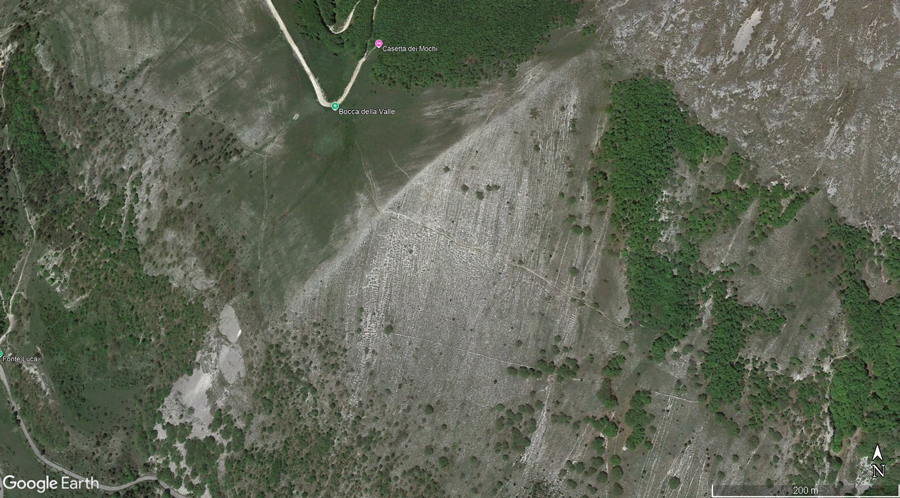 Prateria di Bocca della Valle e pendice sassosa del versante Sud-Ovest del M. Acuto (da: Google Earth, ripresa del 13 maggio 2022)