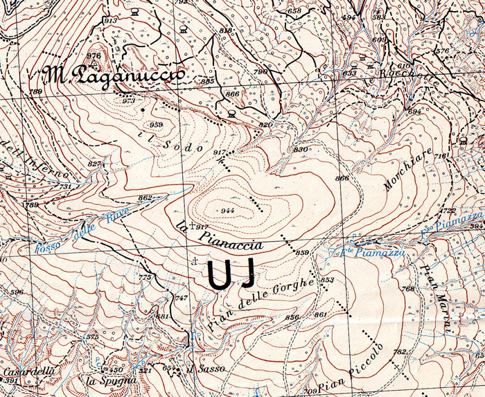Prateria della Pianaccia, arbusteto delle Morchiare e faggeta a Nord de il Sodo (M. Paganuccio). Carta IGM 1:25.000 116 I N.O., rilievo del 1952 (autorizz. IGM n. 4877 del 2-11-1998)
