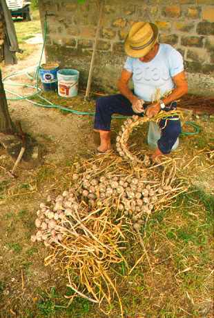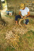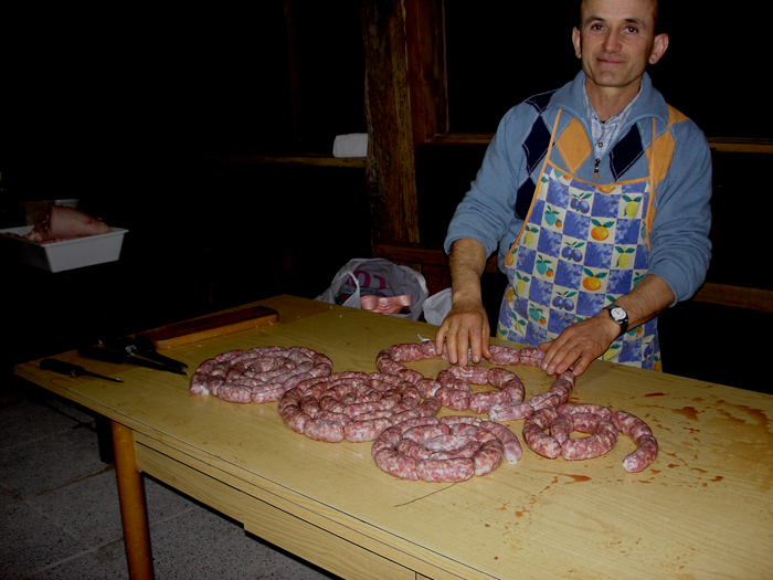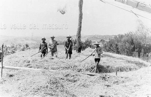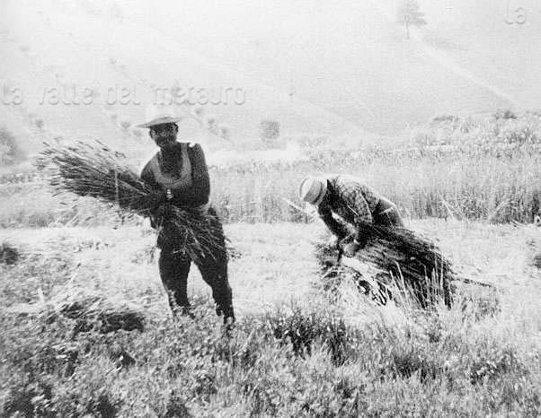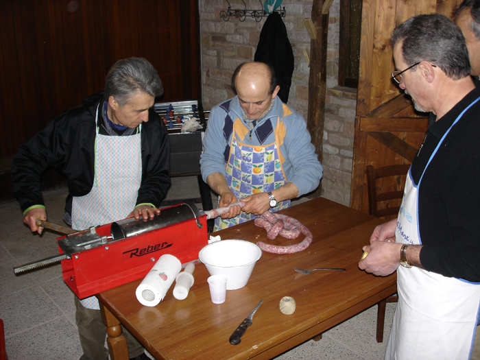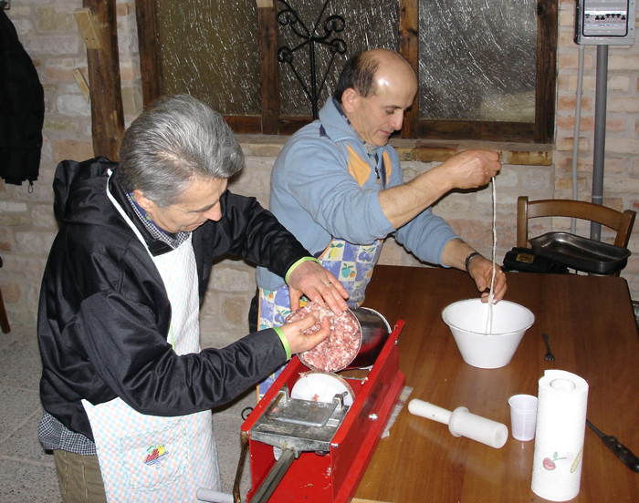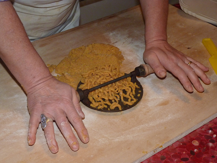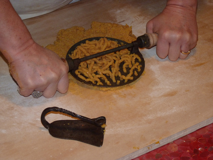 Preparazione dei passatelli col ferro apposito. E' anche visibile, sulla panâra, il râdmatra (raschietto per matra)