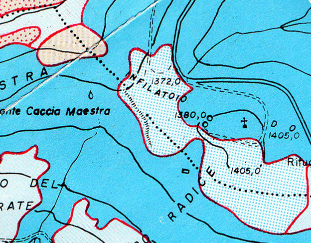 Prati dell'Infilatoio, tra M. Acuto e M. Catria. in azzurro puntinato Cinosureto, in azzurro Faggeta. Carta 1:15.000 (da: BIONDI e BALLELLI 1982)