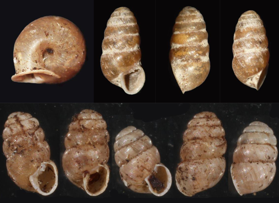 Prima foto: Lauria cylindracea di 3,8 mm in visione ombelicale, con il giro carenato nella zona periombelicale, periferia di Fano, maggio 2017 (foto L. Poggiani); tre foto nella fila superiore: Lauria cylindracea di 4 mm, Metauro a Sant'Ippolito, dicembre 2006 (foto L. Poggiani); nella fila inferiore per confronto: Lauria sempronii, Lucca (Toscana), luglio 1993 (foto F. Welter Schultes, www.animalbase.uni-goettingen.de)