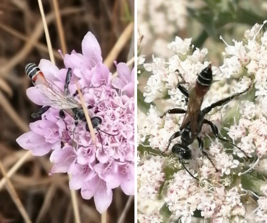 Prionyx kirbii su Sixalix atropurpurea e su Echinophora spinosa, spiaggia di Baia del Re a Fano, luglio 2021 (foto G. Olivieri)