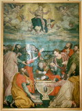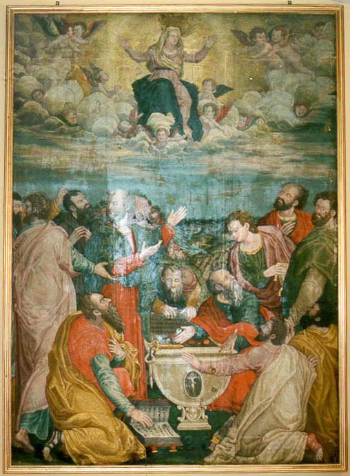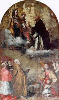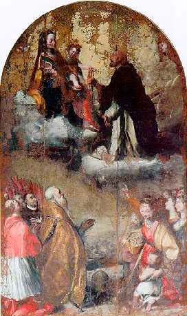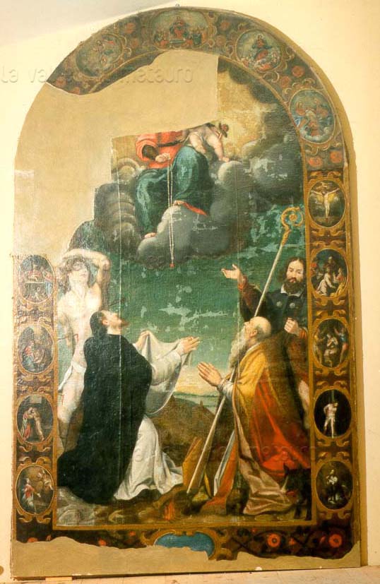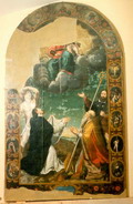 Quadro della bottega del Barocci raffigurante la Madonna del Rosario, San Domenico, San Pio V, il Card. Rusticucci e la sua famiglia (da BELLINI 1997)
