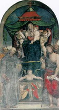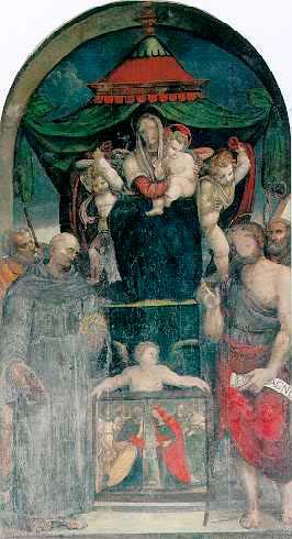 Quadro di Bartolomeo Morganti (1526) raffigurante la Madonna in trono con San Giovanni Battista e San Bernardino (da BELLINI 1997)