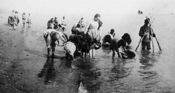 Raccolta di vongole sulla spiaggia di Fano, primi del '900. Sulla destra un uomo che aziona un ferro per calcinelli (da AMADUZZI 1984)