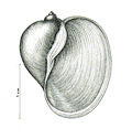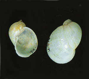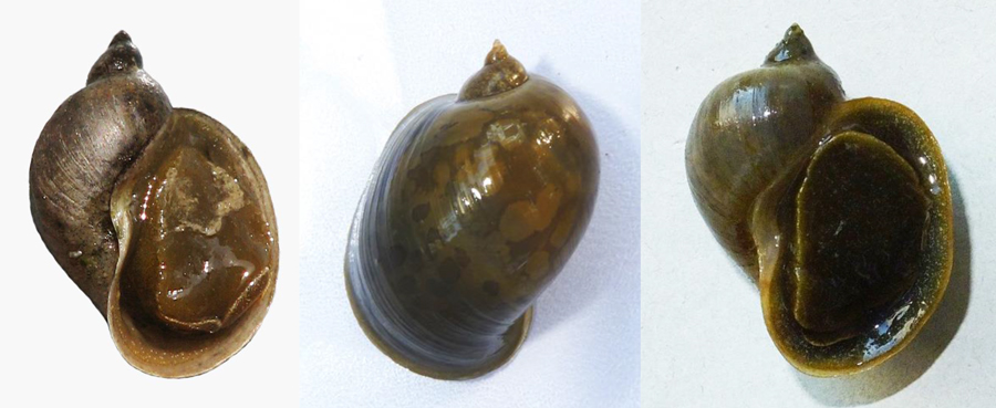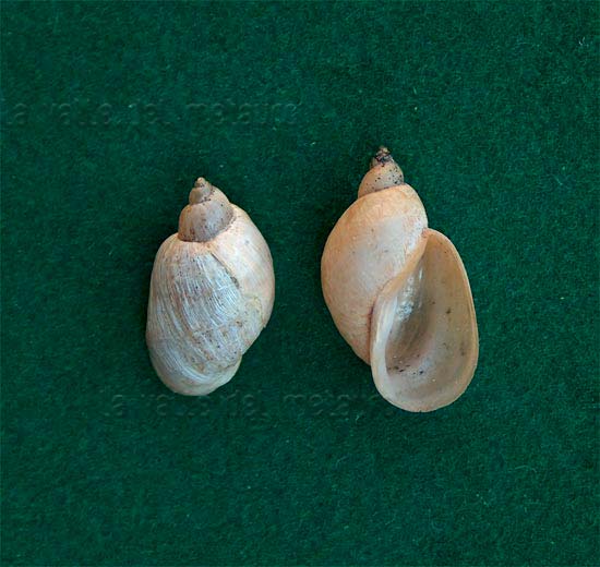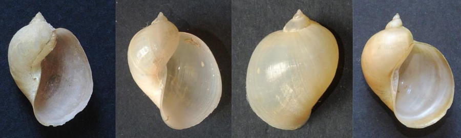Radix cf. auricularia: a sx: Metauro a 4,5 km dalla foce, giugno 2007; al centro e a dx: esemplari di 30 e 34 mm, Lago Vicini lungo il Metauro a Fano, settembre 2011 e aprile 2017