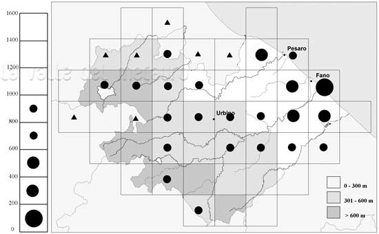 Raganella italiana - Carta di distribuzione in Provincia di Pesaro e Urbino, 2002. Legenda: cerchio grande = 7 e più rilevazioni dal 1980; cerchio medio = 4-6 rilevazioni; cerchio piccolo = 1-3 rilevazioni; quadrato = dato anteriore al 1980; triangolo = dato fuori dei confini della Provincia. Nel grafico altitudinale: cerchio grande = 15 e più rilevazioni; cerchio medio = 5-14 rilevazioni; cerchio piccolo = 1-4 rilevazioni. Ulteriori notizie nella scheda: Come leggere le schede degli Anfibi