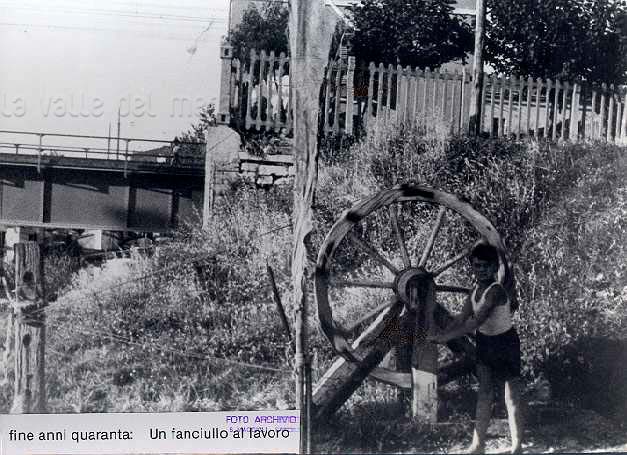 Ragazzo che gira la ruota del cordaio. Porto-canale di Fano e ponte ferroviario, 1946-50
