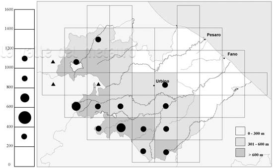 Rana appenninica - Carta di distribuzione in Provincia di Pesaro e Urbino, 2002. Legenda: cerchio grande = 7 e più rilevazioni dal 1980; cerchio medio = 4-6 rilevazioni; cerchio piccolo = 1-3 rilevazioni; quadrato = dato anteriore al 1980; triangolo = dato fuori dei confini della Provincia. Nel grafico altitudinale: cerchio grande = 15 e più rilevazioni; cerchio medio = 5-14 rilevazioni; cerchio piccolo = 1-4 rilevazioni. Ulteriori notizie nella scheda: Come leggere le schede degli Anfibi