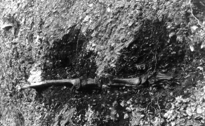 Resti di uno scheletro umano in una tomba a cappuccina, versante di sinistra del F. Bosso poco a monte di Secchiano, novembre 1972