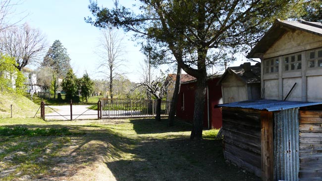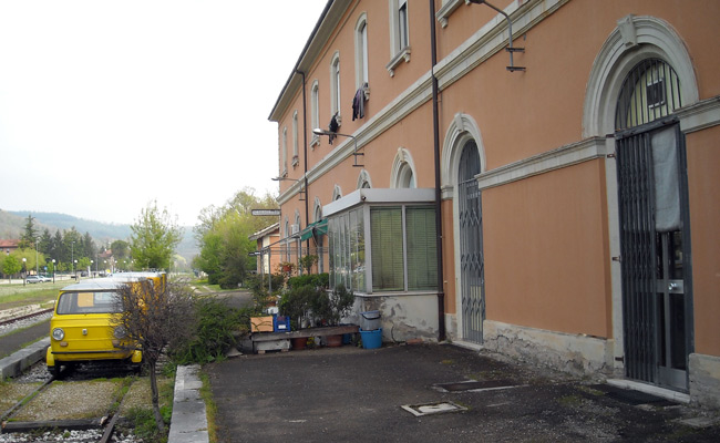 Retro degli edifici; l’area verde di pertinenza ferroviaria è utilizzata come orto. Aprile 2015