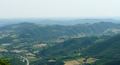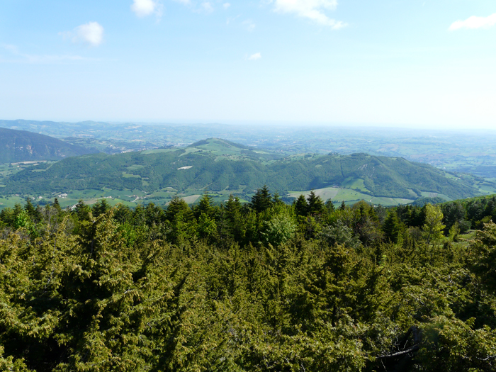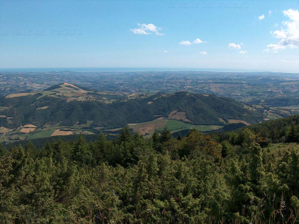 Rilievo di Monte Raggio-Montalto Tarugo visto dal M. Paganuccio (Monti del Furlo), giugno 2005. In primo piano un arbusteto a ginepro