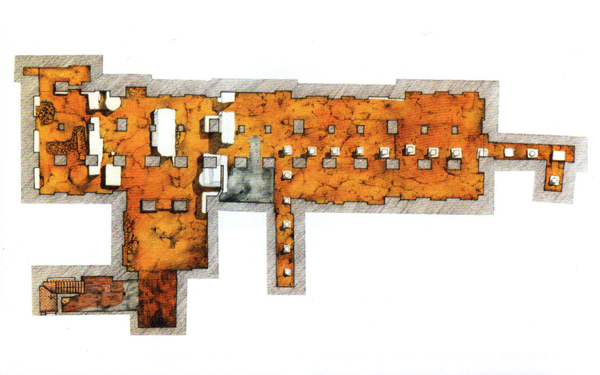 Rilievo del peristilio sotto la ex Scuola L. Rossi in Piazza Amiani a Fano (rilievo e restituz. grafica S. Sgarzini, L. Di Loro e M. Angeloni, da: De SANCTIS 1998)