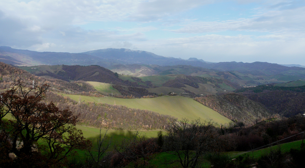 Rilievo di M. Raggio-Montalto Tarugo visto dal M. Paganuccio (Monti del Furlo), maggio 2010. In primo piano arbusteto a ginepro in loc. Morchiare
