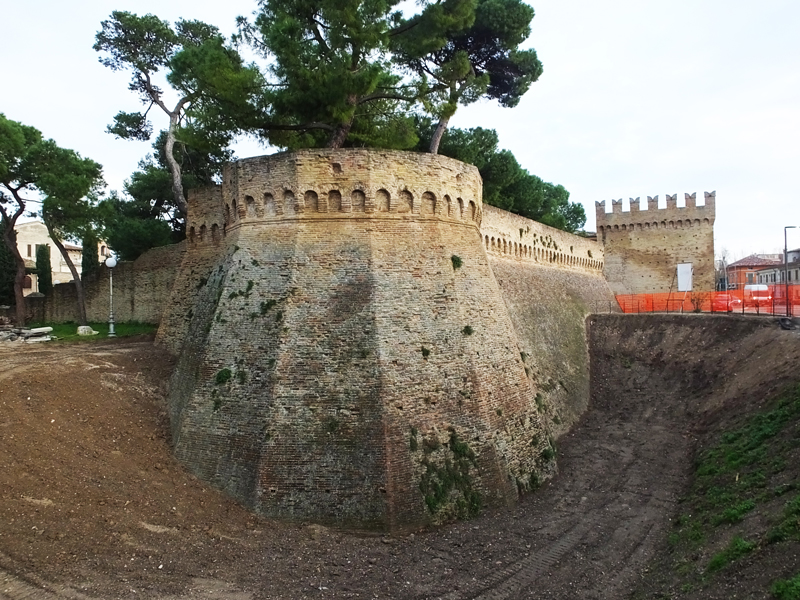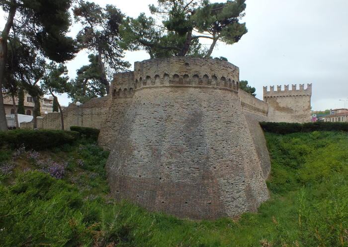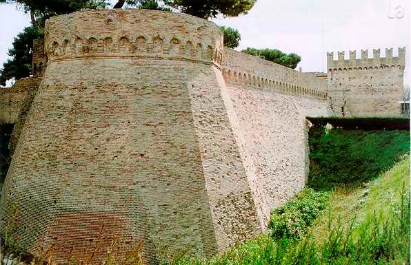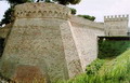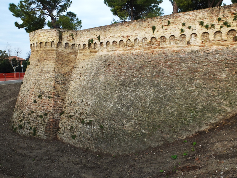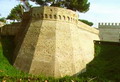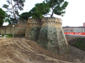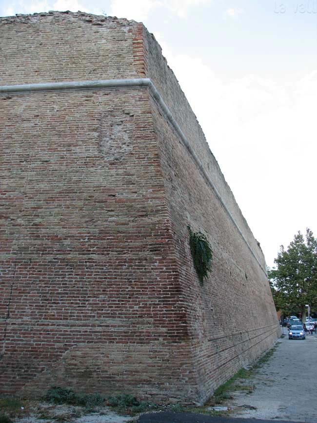 Bastione Sangallo a Fano: fronte su Via Mura Sangallo con ingressi alla piazza bassa a monte e alla piazza alta, agosto 2007